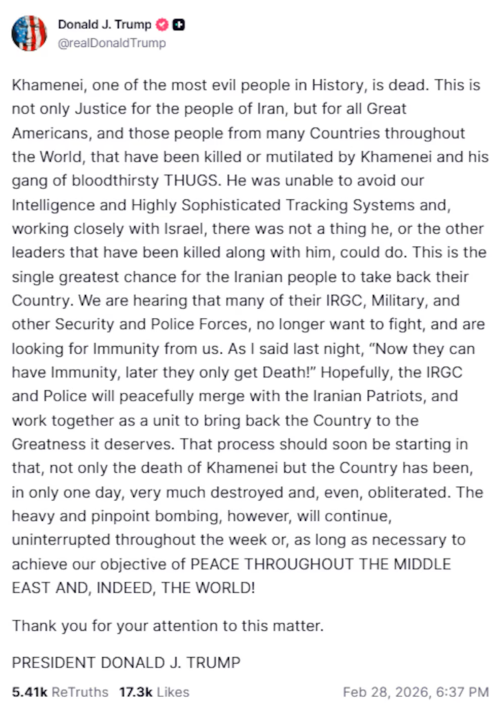 “Khameneí, una de las personas más malvadas de la Historia, está muerto”, comienza, contundente, su mensaje publicado en la red social Truth Social.